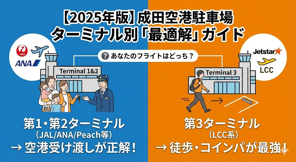 成田空港の駐車場選びで失敗しないコツは、「料金」だけでなく「ターミナルとの相性」を見ることです。